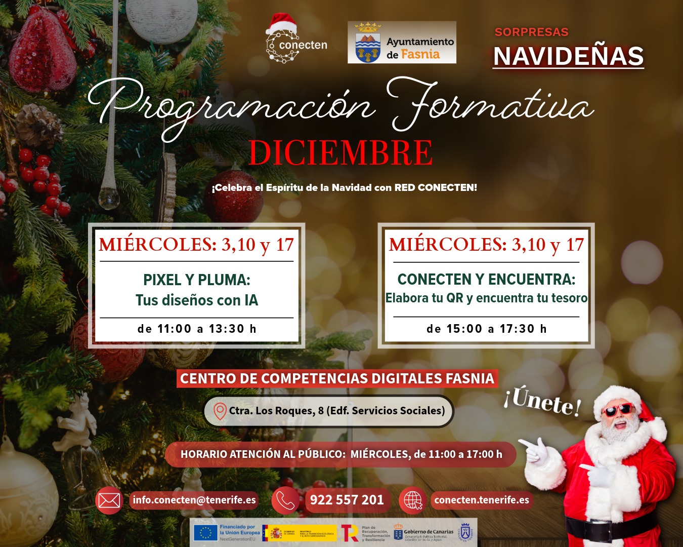 El Ayuntamiento de Fasnia, en colaboración con la Red Conecten, ha preparado una especial programación formativa para el mes de diciembre con motivo de las fiestas navideñas. Bajo el lema “Celebra el Espíritu de la Navidad con Red Conecten”, se ofrecerán actividades creativas y tecnológicas dirigidas a toda la población.